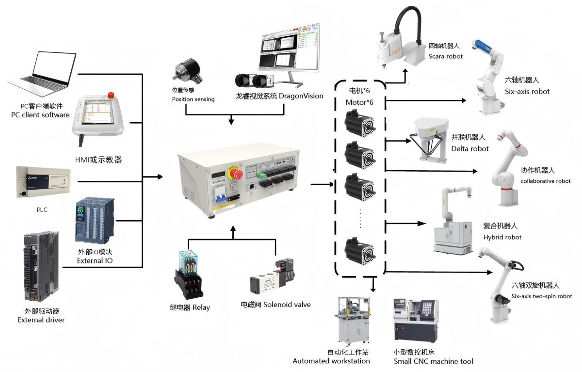视觉龙可根据需求为用户提供四轴机器人、六轴机器人、复合机器人、并联机器人等多种型号。机器人选用中国知名品牌,结构紧凑、体积小、重量轻、运动速度快、重复定位精度高。